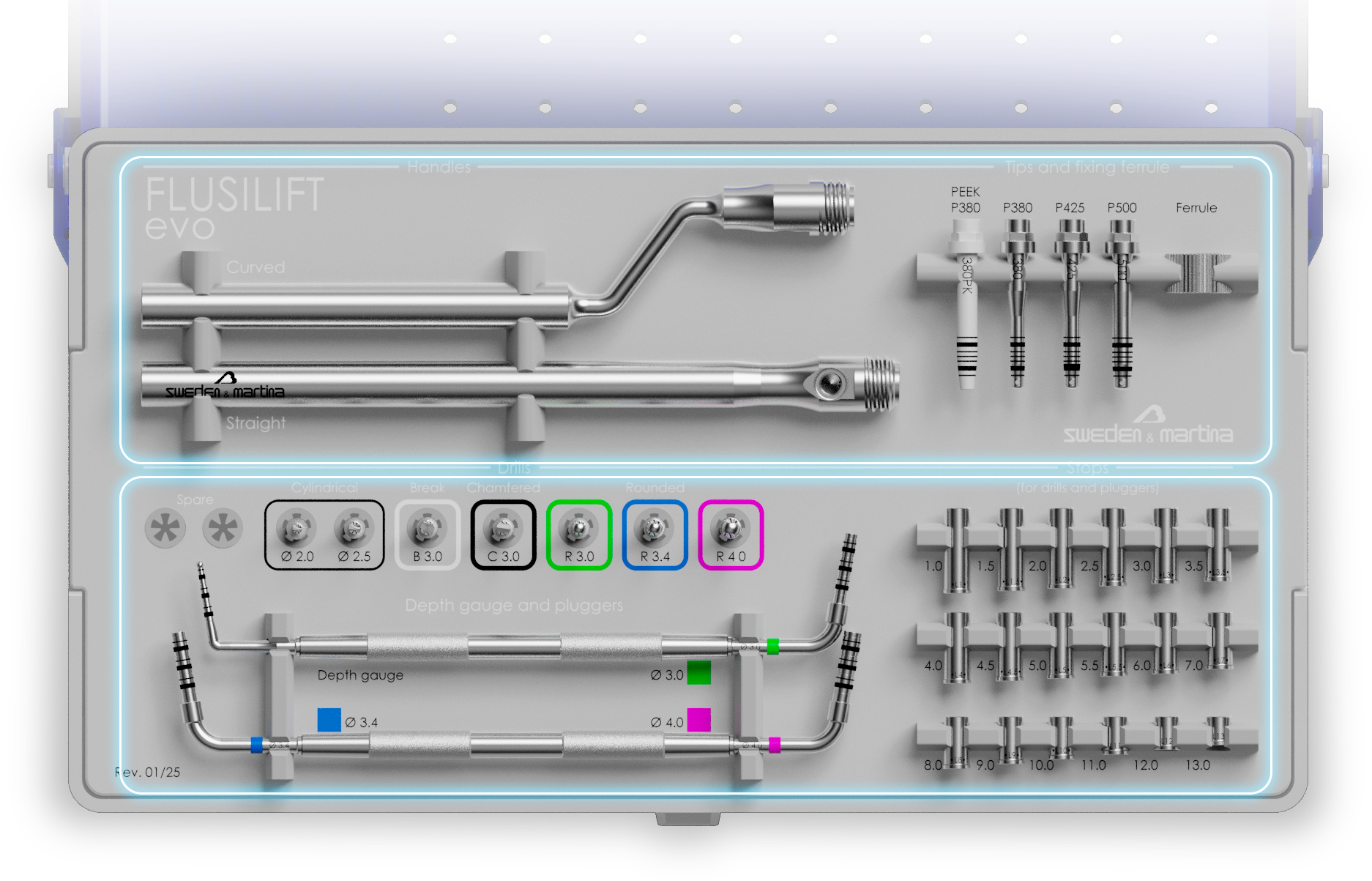 Contiene i manipoli e le punte dedicate alla fase fluidodinamica – un manipolo dritto, uno curvo, una ghiera e quattro puntali con diametri progressivi.