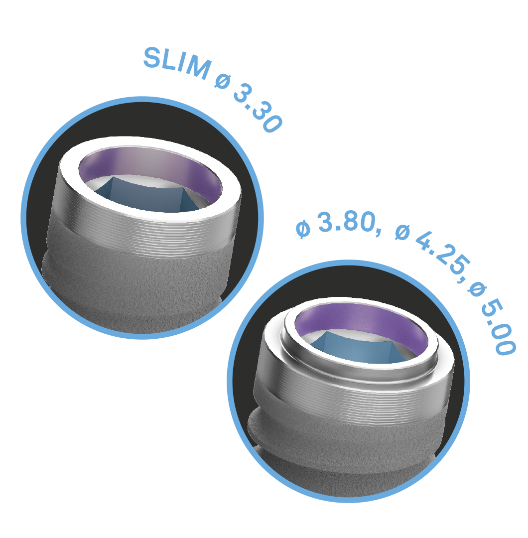 Un’unica connessione interna con collarino esterno, per una versatilità impareggiabile e una protesi più stabile nel tempo. Il protocollo Platform Switching consente una gestione ottimale dei tessuti marginali per preservare il profilo osseo e gengivale.